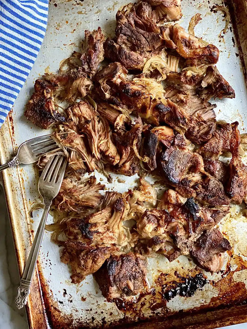 - In a cast iron pan add the marinated pork and put into the oven for approximately 5-6 hours until the internal temperature reaches a minimum temperature of 195ºF.